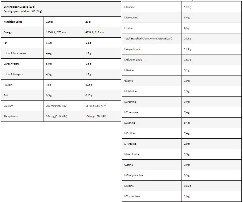 With sweetener. Powder for preparing high protein shakes. Product is designed for athletes and physically active people with a higher demand for proteins. Protein contributes to maintenance and growth of muscle mass.