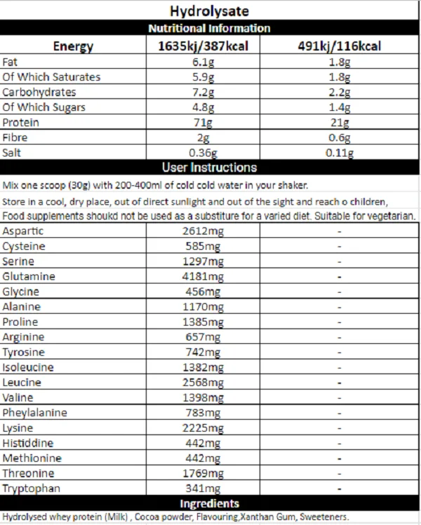 Is a premium hydrolysed whey protein powder, containing 21g of fast acting , high quality protein per serving . Packed with all the essential amino acids (EAA’S) Whilst also being specifically high in both leucine and glutamine.