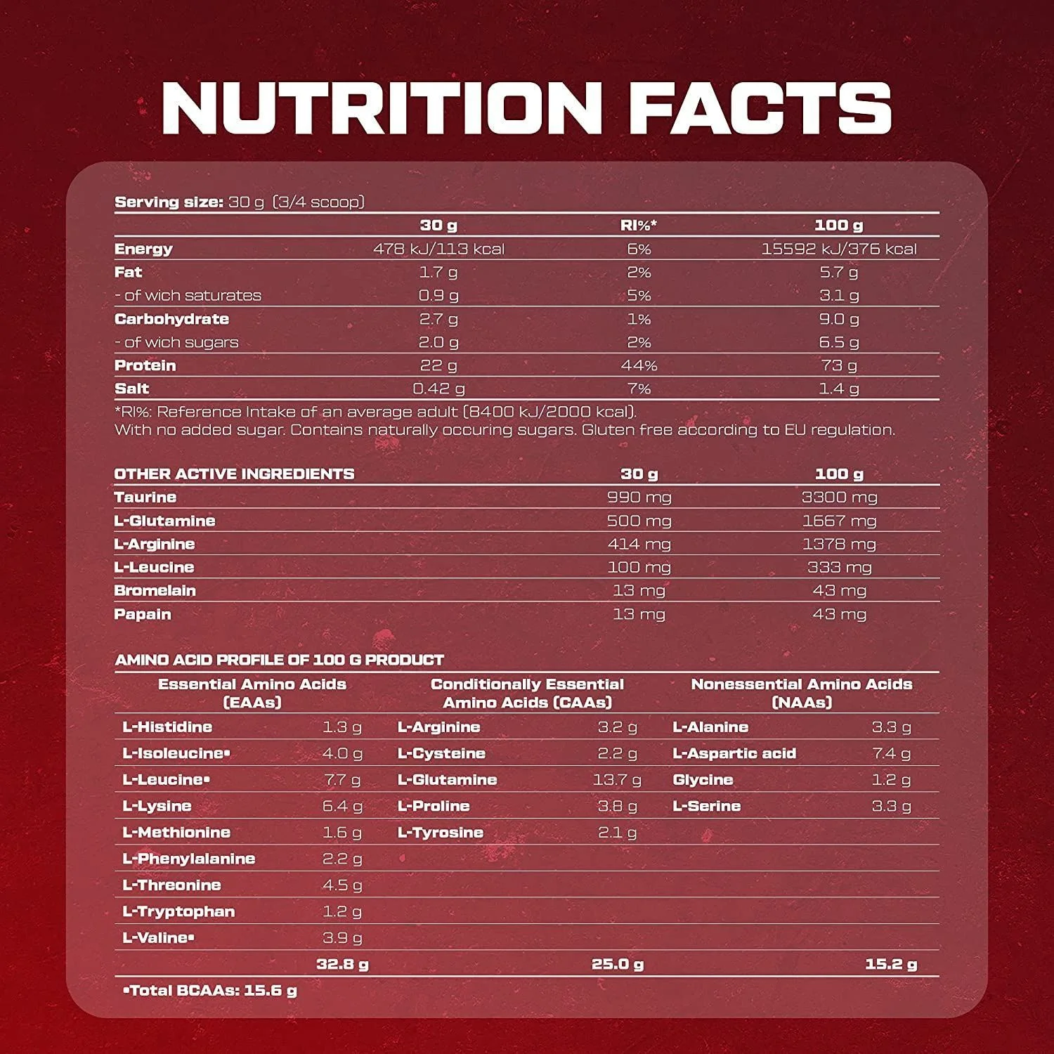 100% Scitec Whey Protein has more added ingredients: an “Amino Acid Matrix” provides extra amino acids, namely Taurine and L-Glutamine. L-Glutamine is the most abundant free amino acid in human blood.